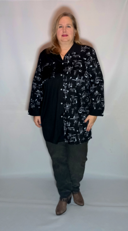 Шикарная  туника - рубашка выполнена из сочетания двух видов трикотажа: черный гладкий ( плотный, умерено эластичный) и с рисунком( чем то похож на ангору, но не пушистый, мягкий, эластичный, средней плотности).