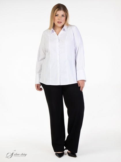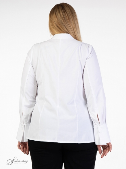 Стильная блуза полуприлегающего силуэта, в стиле «Casual», выполнена из однотонной смесовой ткани с высоким содержанием хлопка. Материал отличается бархатистой поверхностью и легким блеском. Модель с рубашечным воротником на стойке и застежкой на пуговицы в цвет ткни. Верхняя часть линии борта слегка отведена и образует V-образный вырез сразу под воротником, что выглядит эффектно как при застегнутой, так и при расстегнутой стойке. Рукав втачной, длинный, с притачной манжетой по низу. Высота манжеты позволяет носить её на отворот, тем самым регулируя длину рукава. В боковых швах обработаны разрезы. Это лаконичная модель, которая притягивает внимание изысканными нюансами и позволит чувствовать себя элегантно при любых обстоятельствах.