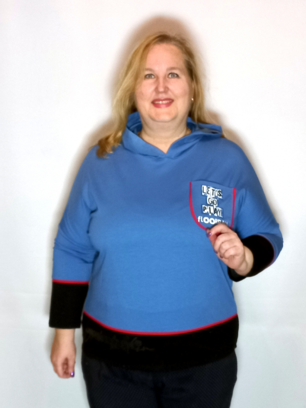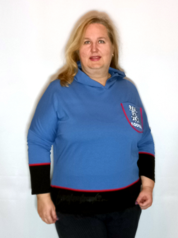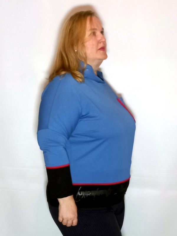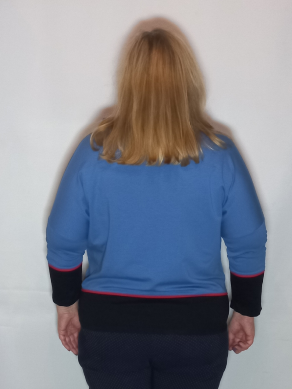 Рукав 3/4, комбинированный, шов между синим и черным трикотажем декорирован красным тонким кантом