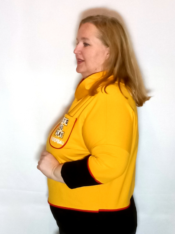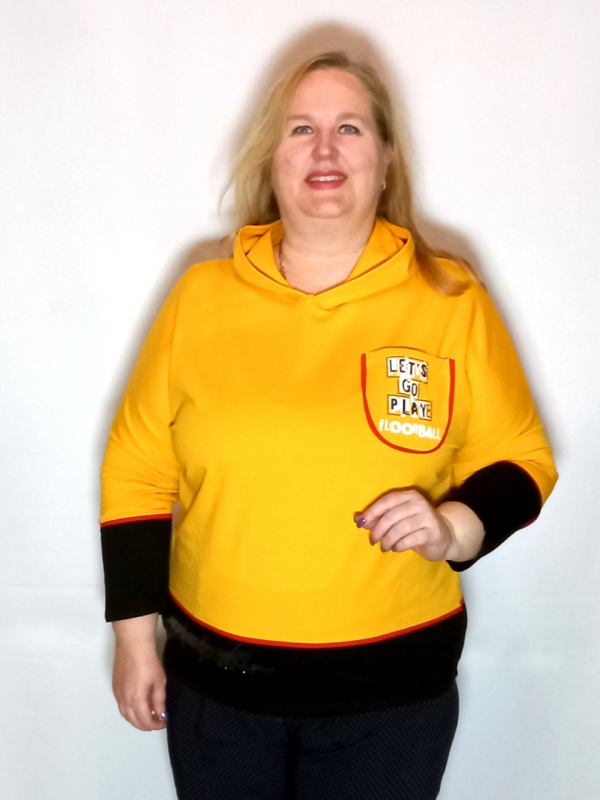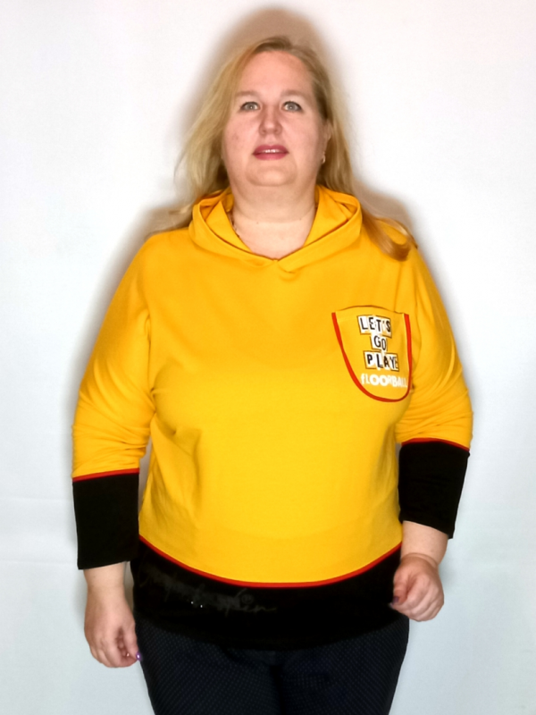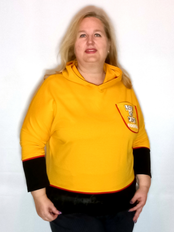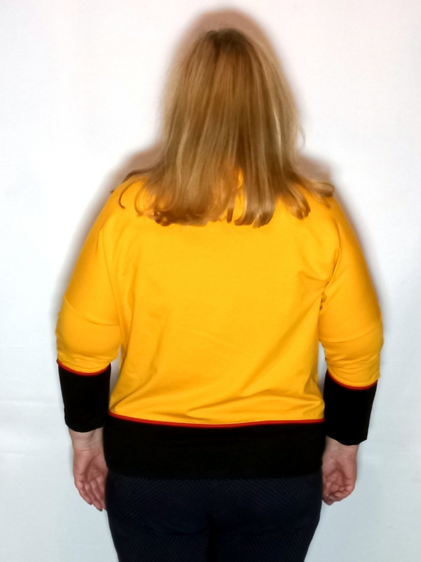 Рукав 3/4, комбинированный, шов между желтым и черным трикотажем декорирован красным тонким кантом