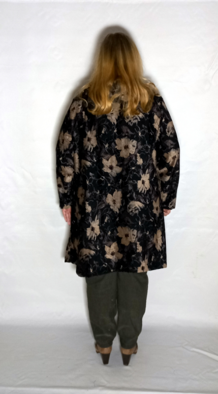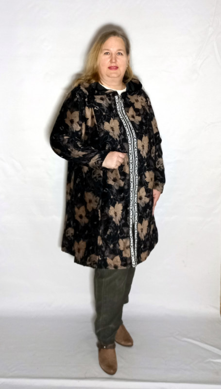 Стильный кардиган-ветровка выполнен из шанель-велюр полотна с интересным принтом. Для отделки использовали тесьму с надписями.