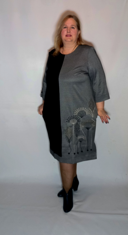 Платье выполнено из плотного трикотажа двух видов : однотонный и с рисунком. Трикотаж приятный, умеренно эластичный