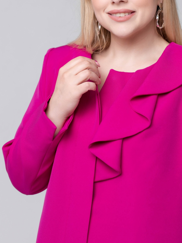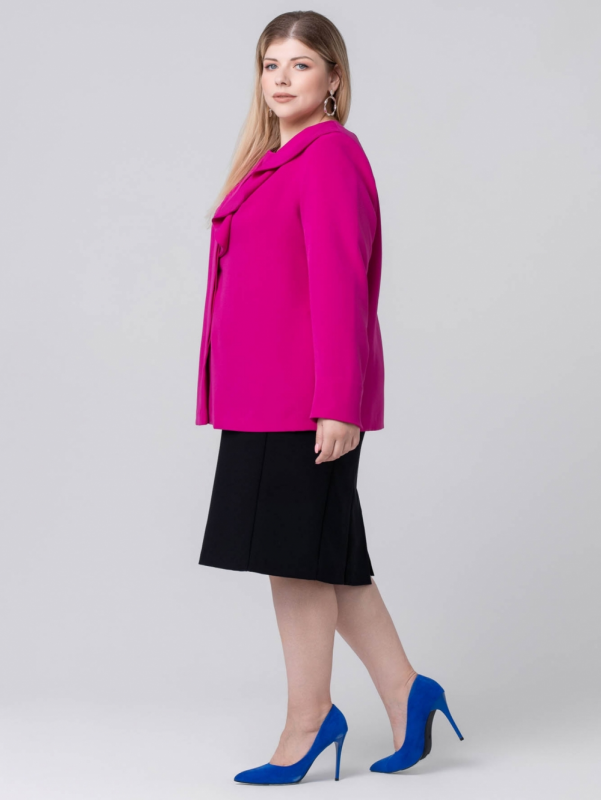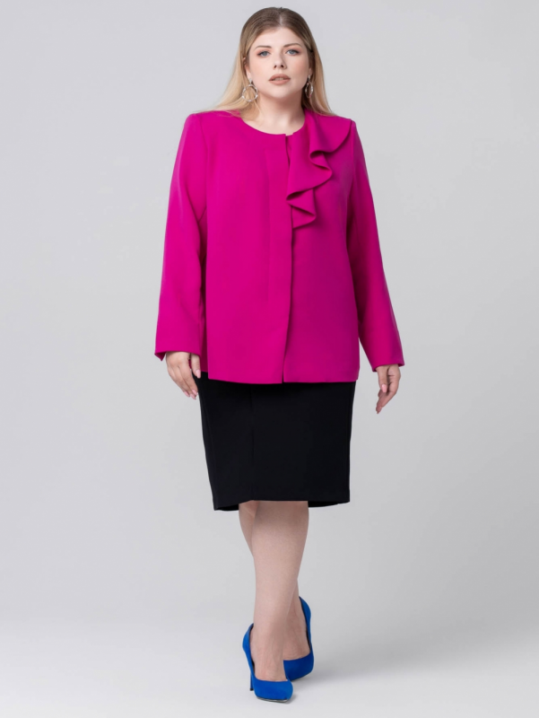 Нарядный жакет прямого силуэта выполнен из яркой смесовой ткани. Модель с округлой линией горловины и длинным втачным рукавом. В локтевом шве обработан разрез, позволяющий легко добиться нужной длины рукава. От левого плеча к центру спускается эффектная драпированная деталь, которая обладает волшебной способностью придавать образу утонченную женственность. По борту обработана суппатная застежка на пуговицы. Эту элегантную модель Вам будет несложно вписать в гардероб, ведь яркий цвет изделия поможет выглядеть современно, динамично и стильно.