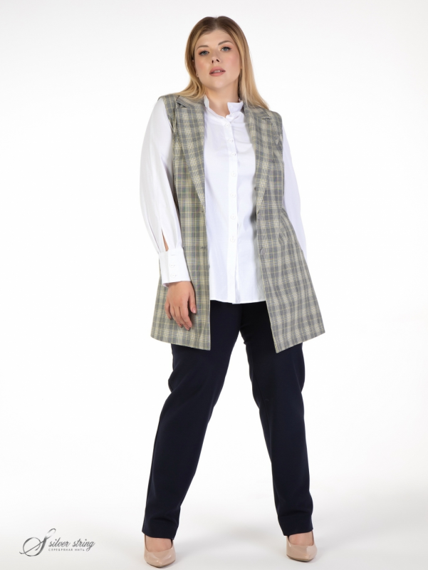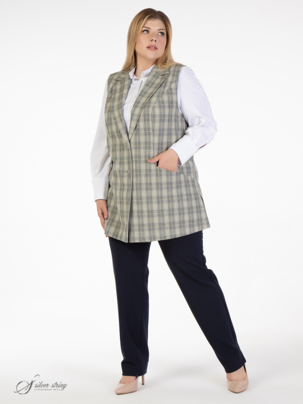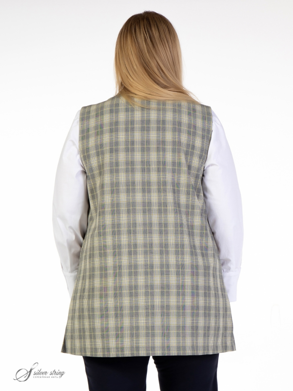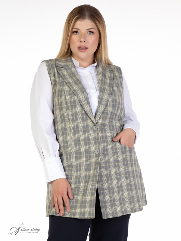 Стильный, удлиненный жакет прямого силуэта выполнен из натуральной смесовой ткани с рисунком в клетку. Модель в стиле smart-casual, с английским воротником на углубленной горловине и застежкой по борту на две пуговицы. Пройменные рельефы, ниже уровня талии, переходят в подрезные карманы. В боковых швах обработаны высокие разрезы. Модель отлично скрывает проблемные зоны и отлично дополнит любой гардероб. Жилет можно носить и с джинсами и с классическими брюками.