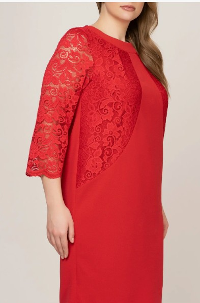Эффектное платье, выполненное в комбинации плотного трикотажа и ажурного гипюра. Модель длиной до колен, чуть заужена книзу. С круглым вырезом горловины. Крой и игра фактур имитируют кружевное болеро с втачным рукавом 3/4.