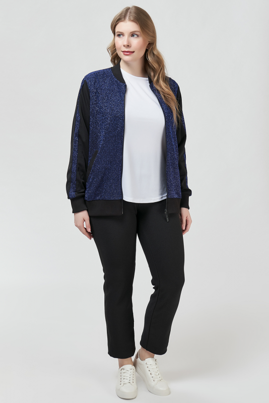 Модная ветровка бомбер, выполненная в стиле «спортивный шик», в комбинации блестящего и матового трикотажа, с длинными втачными рукавами на манжетах и с блестящими лампасами, застежке-молнии, воротником-полустойкой, косыми прорезными карманами с листочкой.